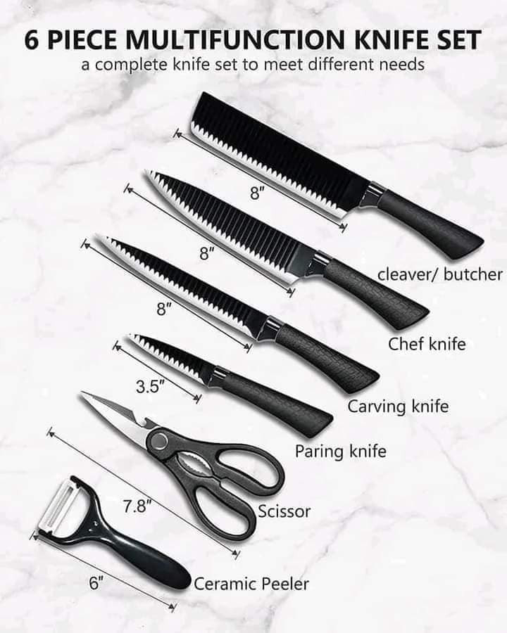 আপনার রান্না ঘরের সৌন্দর্য আরো বাড়িয়ে তুলতে আপনাদের জন্য নিয়ে এলাম সুন্দর ডিজাইনের ৬ পিছের একটি ছুরি সেট বক্স।গৃহিণীদের জন্য ছুরি অনেক দরকারি একটি জিনিস, ছোট থেকে বড় সব কাজেই লাগে। তাই দরকারি ৬ রকমের ছুরি যদি একসাথেই পাওয়া যায়, তাহলে তো মন্দ হয় নাহ। ঠিক তেমনি এই 6Pcs Kitchen Knife Set টি