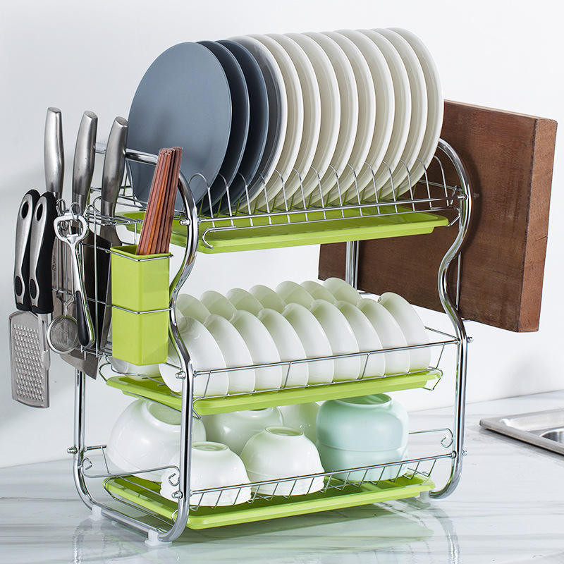 Our 3-layer dish drainer can hold more dishes & bowls. Constructed with heavy-duty and rust-resistant material for stability and durability. Easy store, stable stand can let your cutlery and fork cups safely placed.